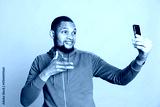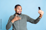 African american smiling confident man chatting on video conference with his friends, catching up and giving latest news against blue background. Young guy pleased with his discussion.