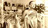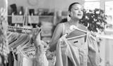 Near rack, Asian woman buy summer clothes, choose some items. Discount season, promotional offers. Client elect between several goods options during discount season