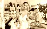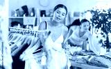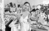 Girl view assortment in clothing department, buying summer clothes. Off line cloth store from leading retailer. Female client looking for something in background...