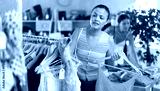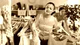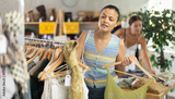 Positive joyful woman looking for fashionable clothes in a clothing boutique