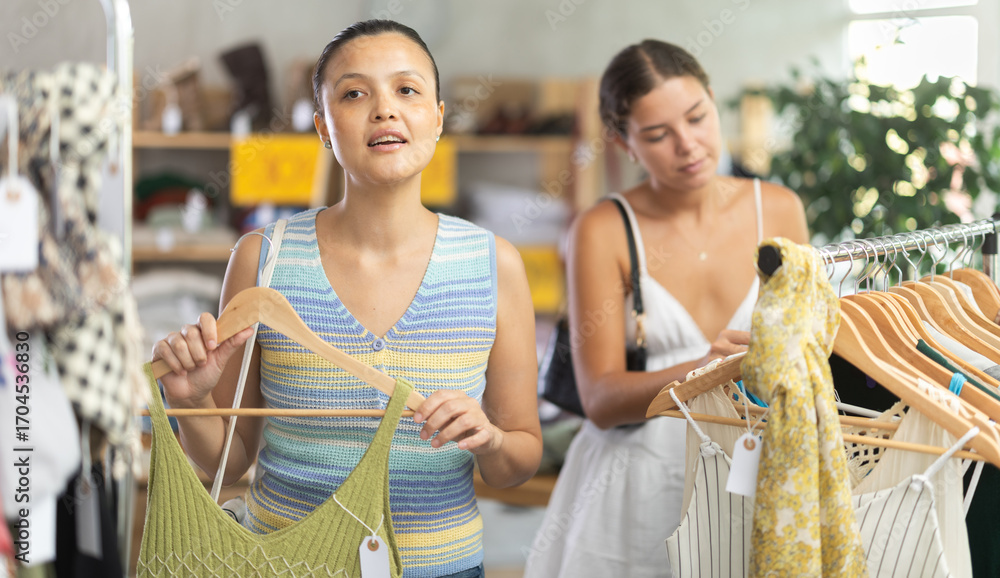 Two positive young ladies looking for some summer wears during sell-out in retail outlet