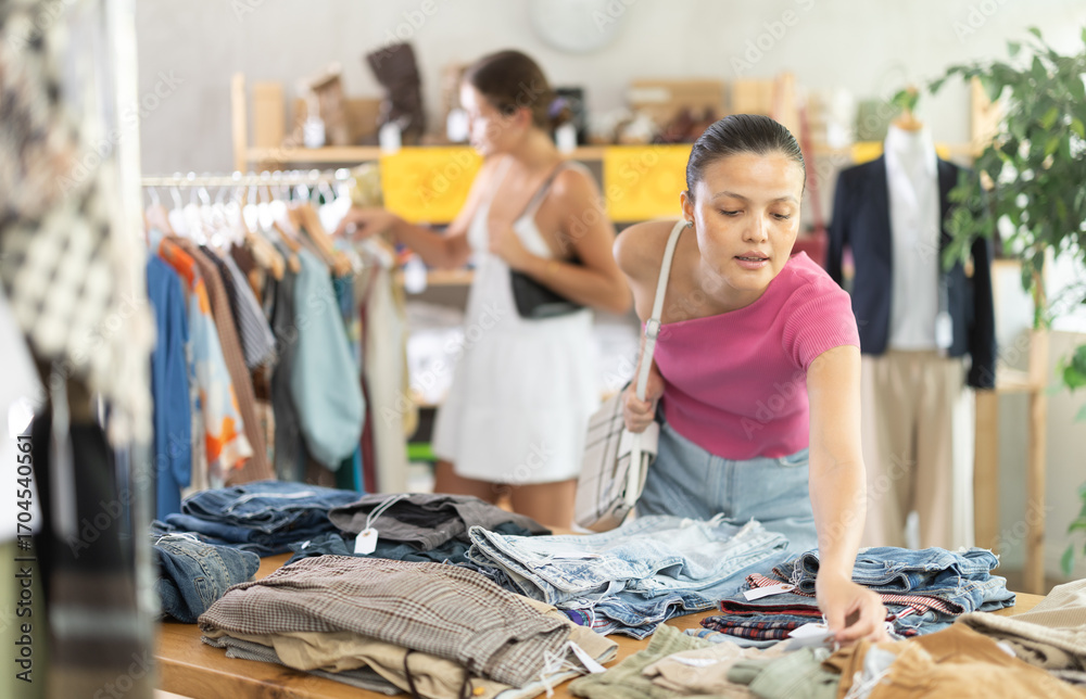 Asian woman view assortment in clothing department, buying trousers or shorts. Off line clothing store from leading retailer.Female client looking for something in background