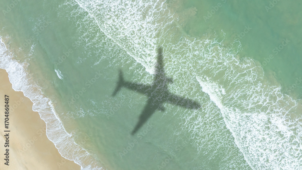 Aerial view of shadow passenger plane silhouette and sandy beach blue sea with waves at sea beach summer vacation sea travel concept