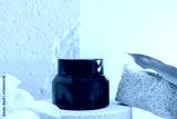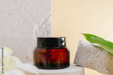 Cosmetic bottles on a stone podium, Blank label package for mock up on a beige background. The concept of natural beauty products.