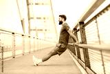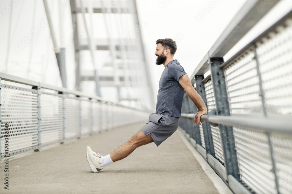 Young Bearded Athlete Performing Tricep Dips on a Modern City Bridge