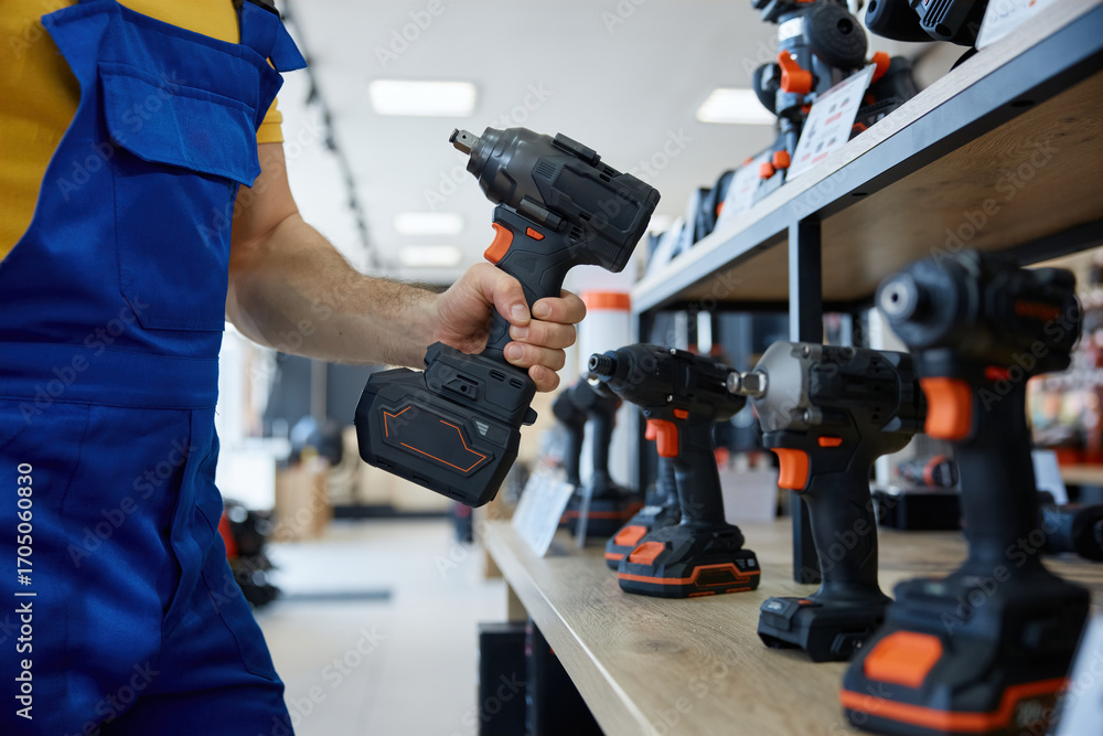 A man is holding a black and orange handheld drill in both hands
