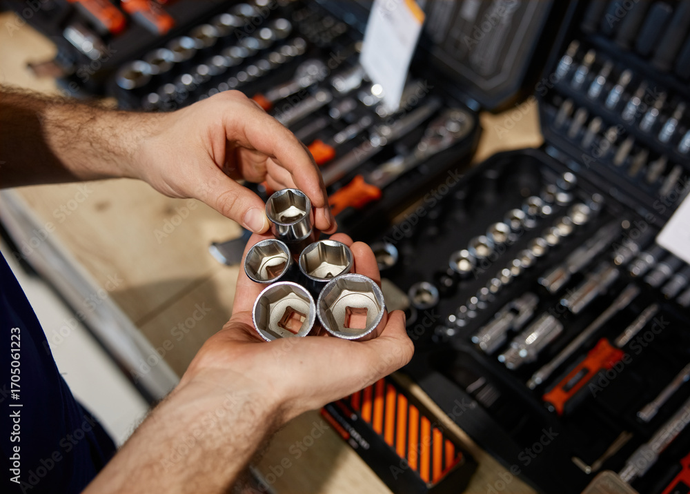 A man is firmly gripping a collection of various sockets in his hands