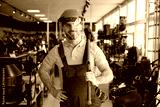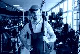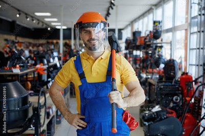 A man worker in overalls and a helmet is holding a hammerhead in a store