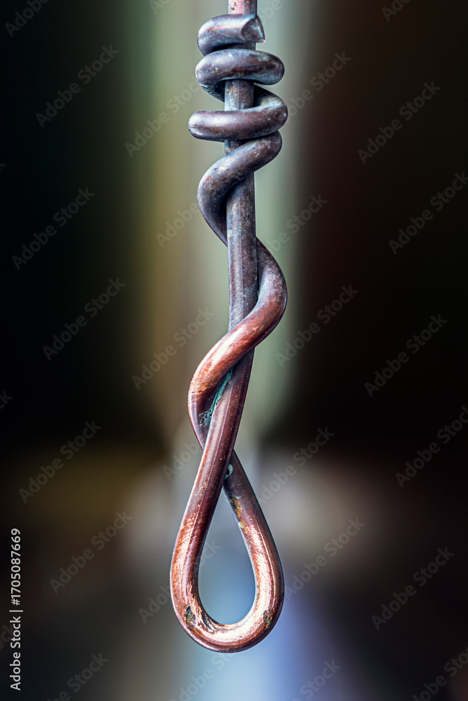 Twisted, patinated copper wire in a dark industrial setting, close-up view