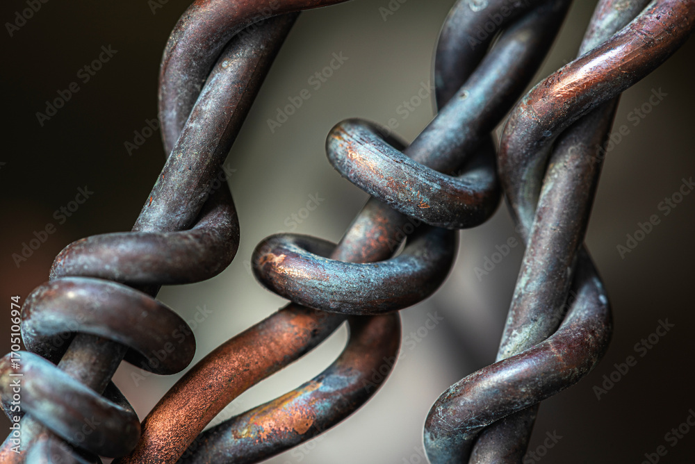 Twisted copper wire photographed up close, showing patina and detailed surface texture against a dark industrial background