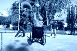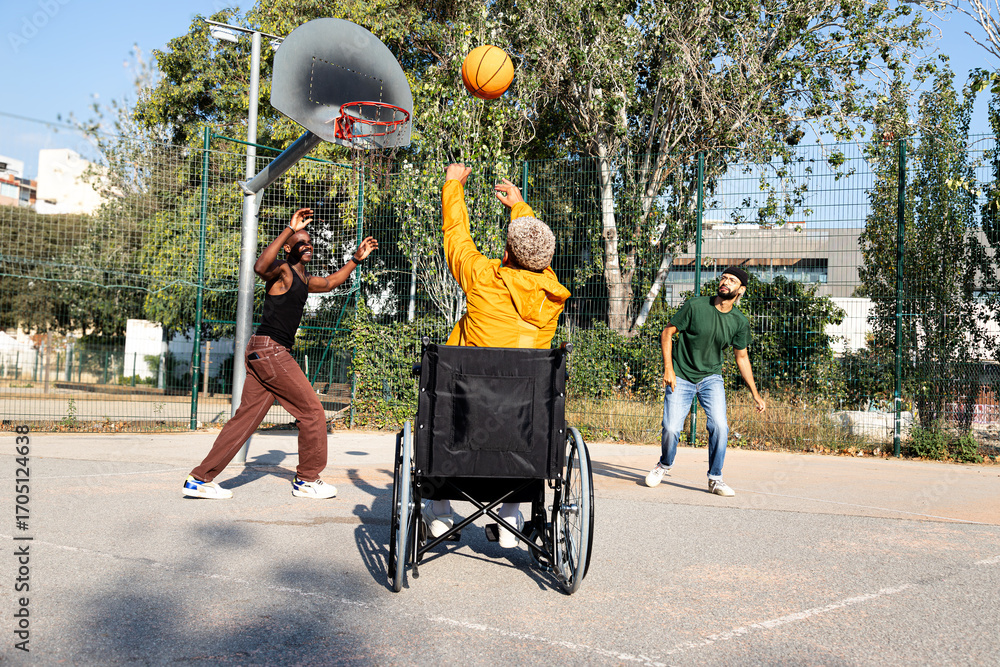 African American man in a wheelchair throwing ball in court playing basketball with friends.