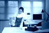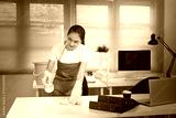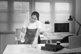 Smiling woman disinfecting desk with spray cleaner and cloth in office, concept of hygiene and sanitation