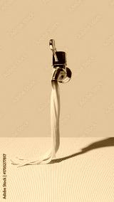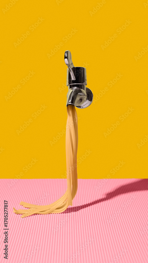 Faucet pouring spaghetti strands downward onto pink surface with yellow background. Concept of creative advertising, viral social media art, education, poster design, restaurant branding.