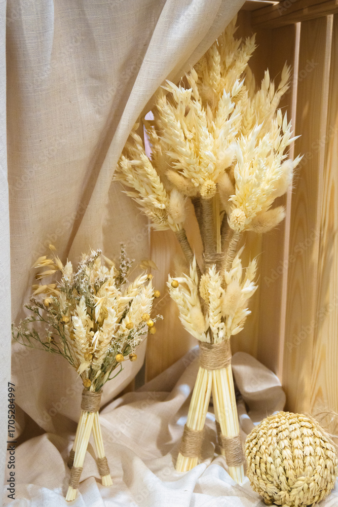 Rustic bouquets of dried wheat, oats, and natural grasses, tied with twine, rest against a soft fabric and wooden background. Perfect for autumn, harvest, eco-friendly decor, or craft projects.