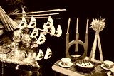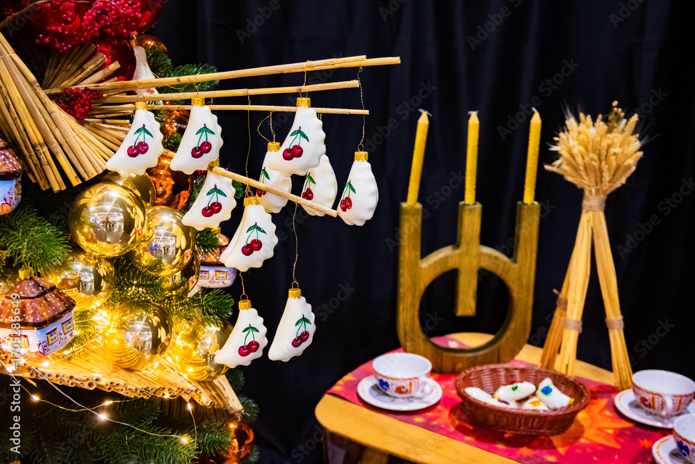Cozy Ukrainian Christmas display featuring a decorated tree with golden baubles, traditional house and varenyky ornaments, beeswax candles, a didukh, and festive table setting. A blend of folk art and