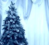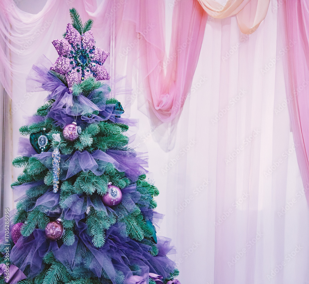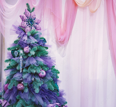 Elegant Christmas tree decorated with shimmering purple tulle, glittery ornaments, and a sparkling star topper, set against a soft pink and white curtain background. Perfect for festive, whimsical, or
