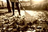 Close-up of female volunteer collecting fallen leaves on green grass. A woman in yellow raincoat rakes a pile of autumn leaves in a sunny park. Concept of volunteerism, ecology, and seasonality.