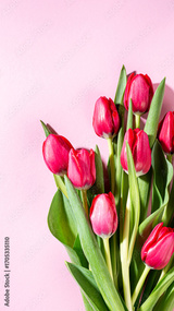 A stunning arrangement of pink tulips with lush green leaves, set against a soft pastel background, perfect for floral design inspiration, stories templates with copy space