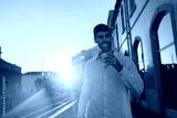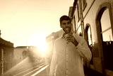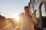Handsome young manager drinking takeaway coffee at sunset in the city