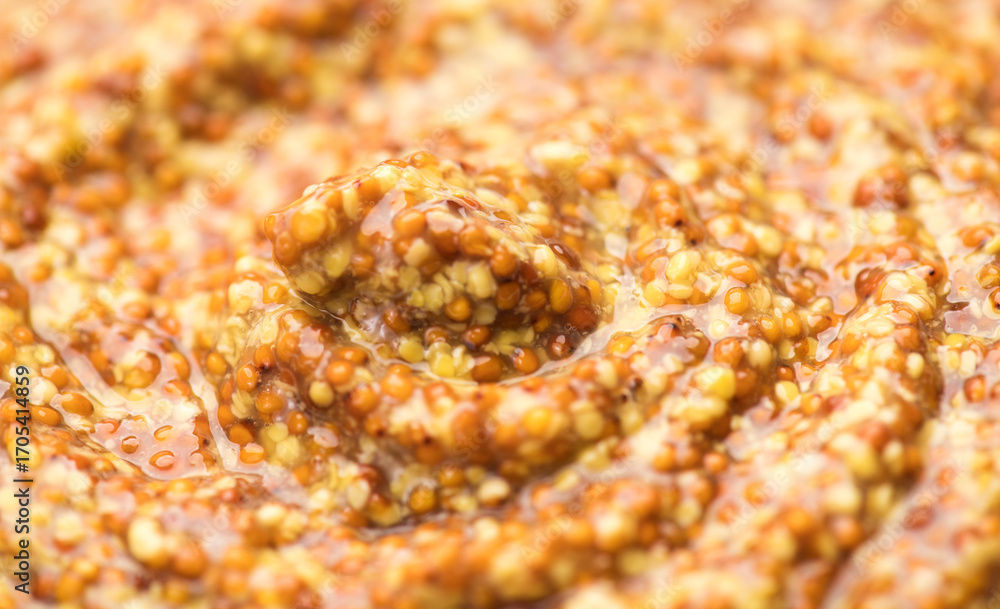 Mustard, French Dijon mustard sauce with whole seeds background. Grainy texture. French pickled mustard seeds sauce texture. Top view, flat lay, from above.