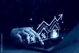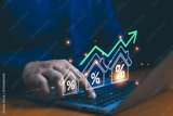 Real estate mortgage growth concept with house icons, percentage signs, and rising trend graph, symbolizing property investment, housing market, and increasing mortgage rates Real estate and mortgage