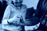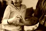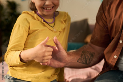 Caucasian child girl smiling while playing thumb wrestling game with adult Caucasian man, both hands visible with focus on interaction, man showing tattooed forearm, girl wearing necklace