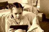 Caucasian girl child sitting on floor holding colorful lollipop in one hand while watching smartphone screen with focused expression, bedroom background visible behind subject