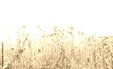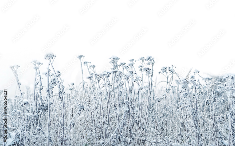 frozen dry plant stems on field, abstract nature light winter background. beautiful winter or late autumn seasonal landscape. wild grass in hoarfrost. cold frosty snowy weather.