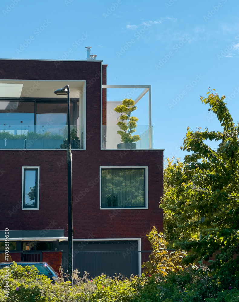 Modern urban architecture with balcony plants. Contemporary building facades and geometric design,