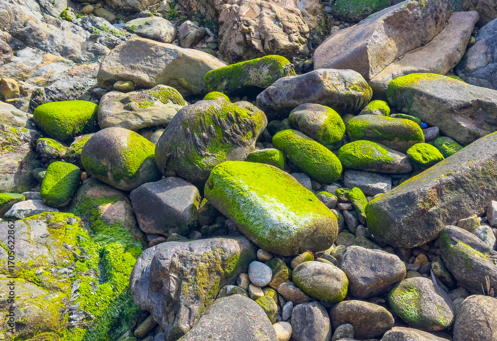 Stone with green moss texture. Natural surface closeup with lichen detail, rough weathered pattern,