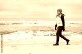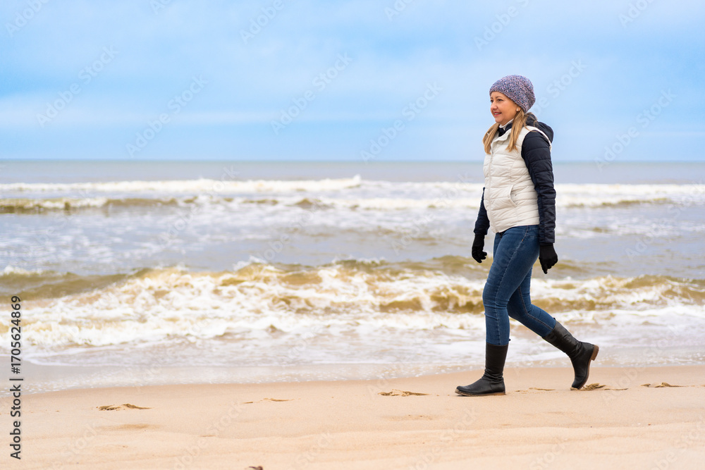 Beautiful mature woman walking on sandy beach in wintertime. Side view