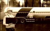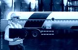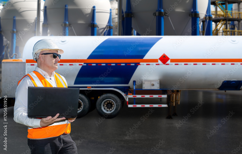 Energy logistics. Safety inspector in helmet and reflective vest uses laptop to control hazardous material transport near fuel tanker truck at industrial storage facility.