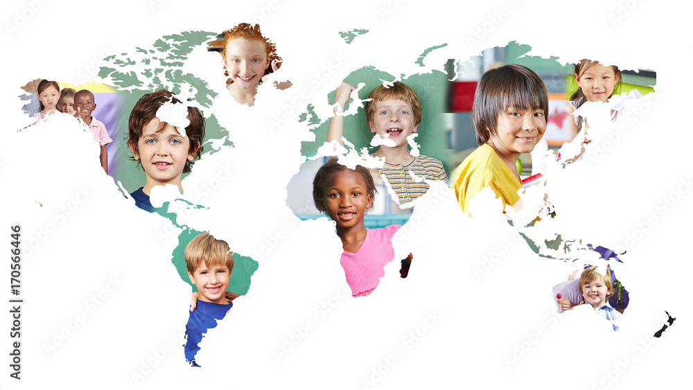 Multikulturelle Weltkarte mit vielen Kindern in Schule