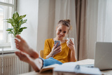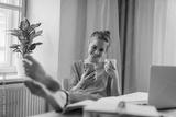 Female student taking break during study session, scrolling on phone and drinking coffee.