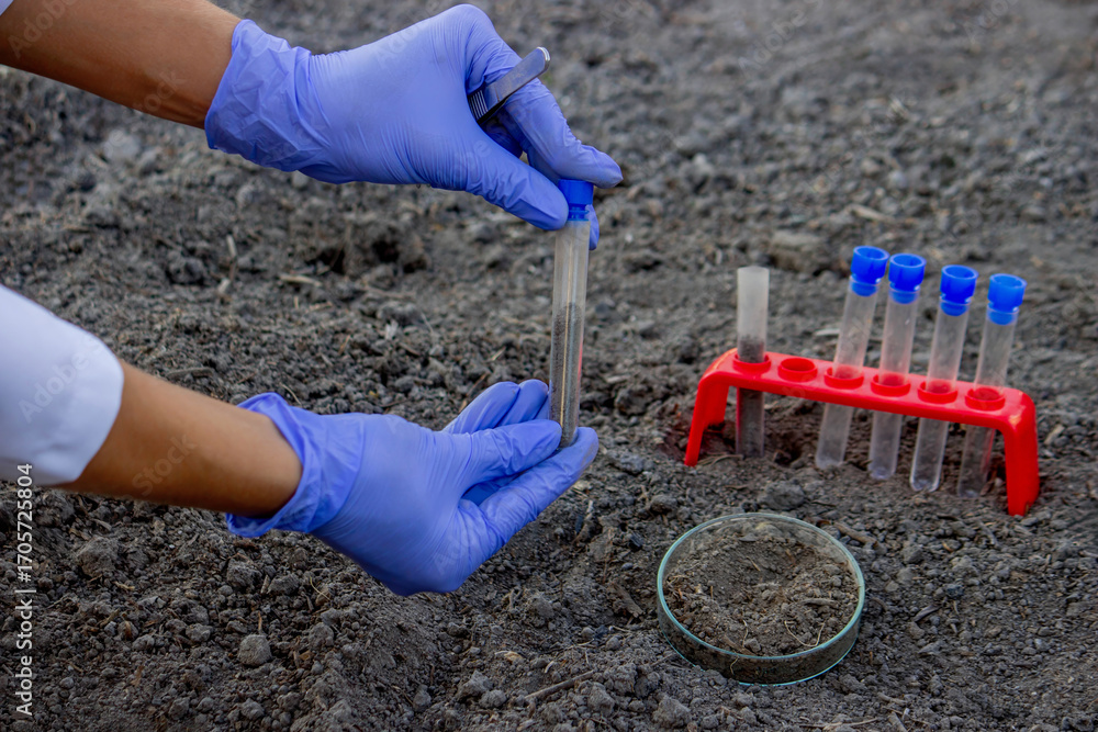 A scientist takes soil into a test tube for analysis. Selective focus.