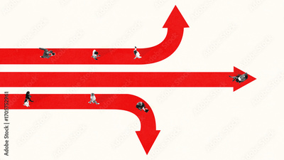 Trendy collage. People moving in different directions on red arrows representing choice, strategy and destiny. Concept of decision making, career paths, psychology, and emotion of seeking clarity.