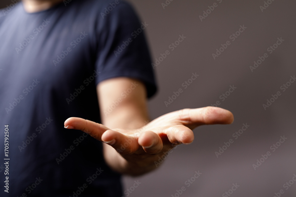 Close-up image of a man's hand outstretched, symbolizing help, support, giving, and receiving. Perfect for concepts of charity, donation, and care.