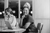 Professional women working and smiling in a modern office setting