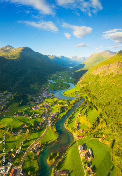 Nature in fjords. Traveling through the Norwegian fjords. Stryn, Norway. River in a mountain valley. Scandinavia. View of nature from the drone. Background, wallpaper, postcards.