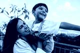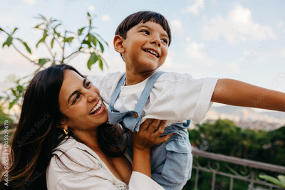 Mother and son enjoying playful moment together outdoors on a sunny day
