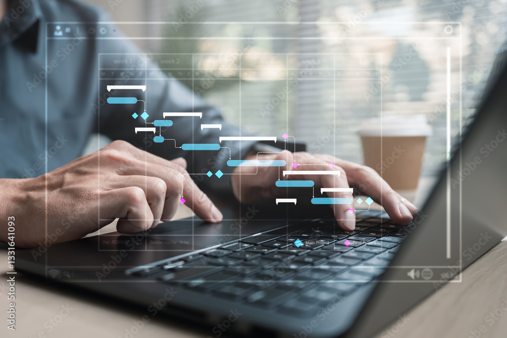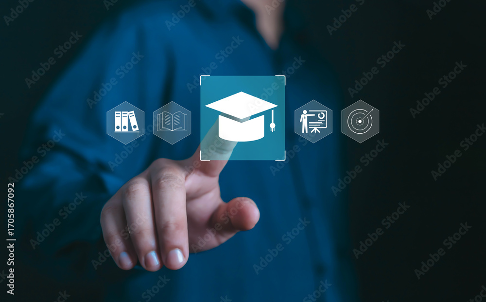 Businessman hand touching digital graduation cap icon with online education, e-learning, academic study, training system, smart learning platform concept for modern knowledge and professional growth.