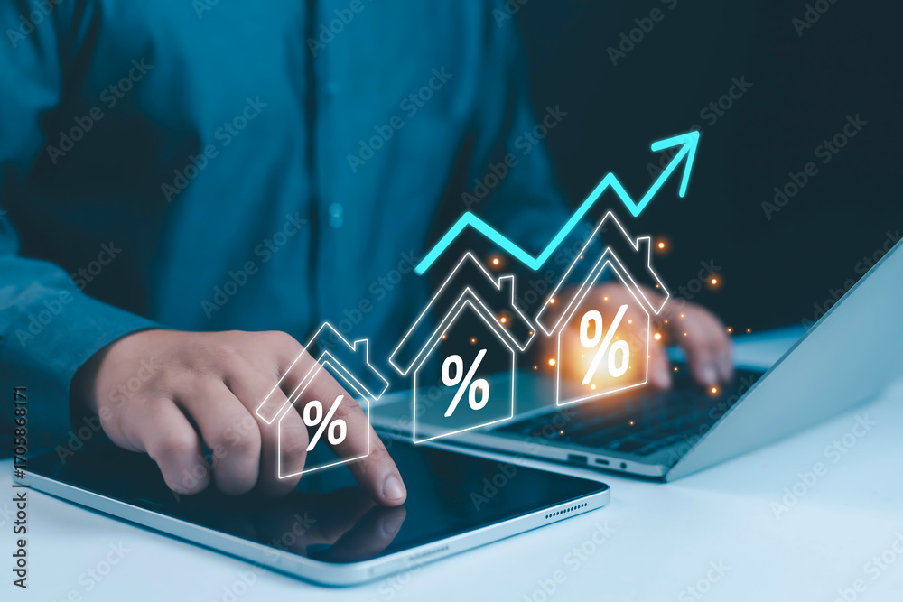 Businessman hand using tablet and laptop with rising house icons, mortgage interest rate growth, real estate investment, housing analysis, and financial planning concept for property business success.