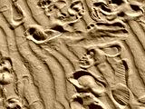 Beach sand with human footprints. Closeup texture of granular surface with natural wavy lines, steps