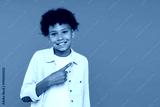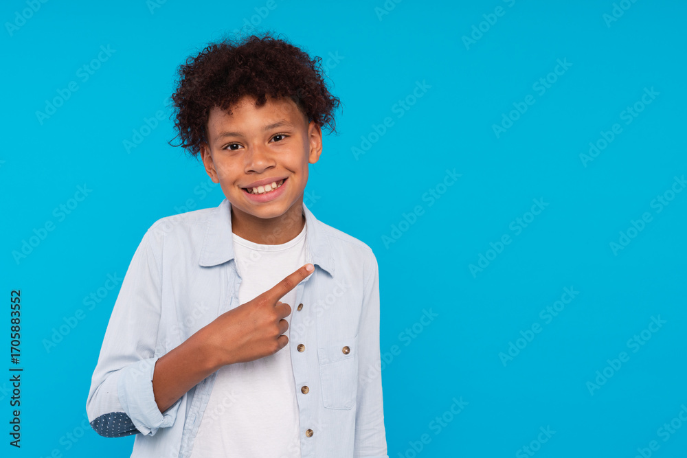 Smiling African-American preteen boy male child kid elementary primary school pupil in casual wear showing pointing index finger at copy space for promotional ad on blue background.