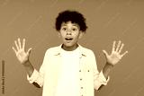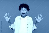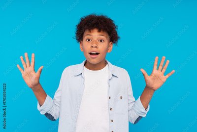 No way, I can't believe! Portrait of funny amazed school boy keeping hands up in astonishment, looking surprised and sarcastic at camera, excited shocked by sudden news. studio shot blue background