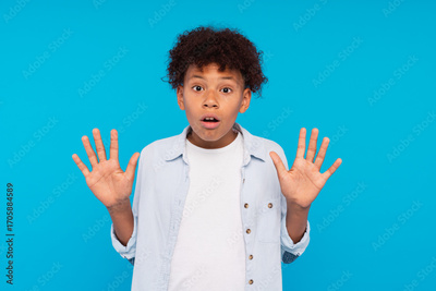 Wow. Studio shot of emotional African American little boy raising eyebrows keeping hands up in astonishment being surprised shocked, showing true astonished reaction on unexpected news isolated