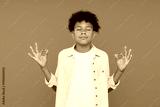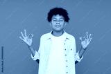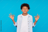 Peaceful calm little boy of African appearance wearing casual t-shirt keeping his eyes closed and smiling, meditating isolated in studio. Conscious dark skinned schoolboy practicing meditation