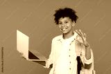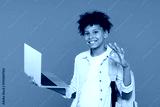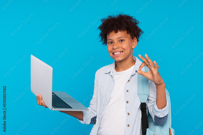 African-American school preteen boy elementary primary male pupil showing okay gesture holding laptop using it for surfing internet, distant studding ,e-learning remotely isolated in blue background