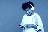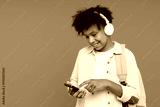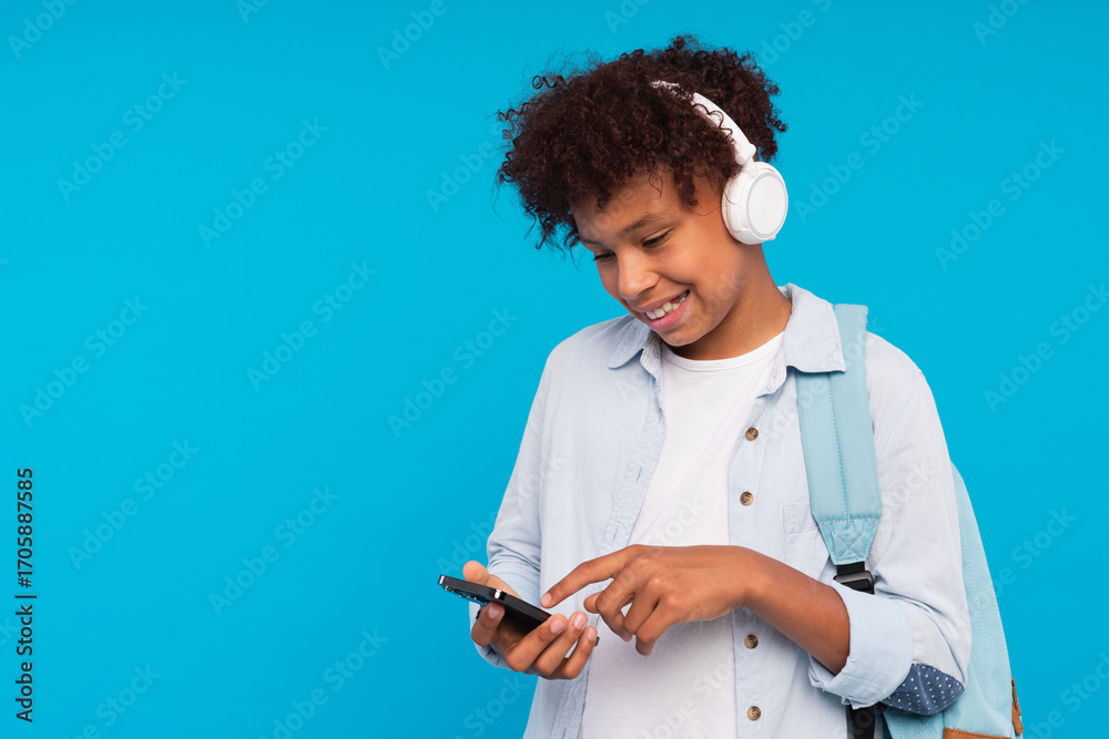 African-American black school preteen boy elementary primary male pupil wearing headphones holding smartphone choosing song using streaming service listen music isolated background copy space