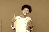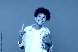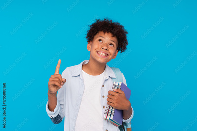 Smiling African-American school boy elementary primary male pupil holding books copybooks having idea pointing index finger up isolated on blue background. Education back to school concept